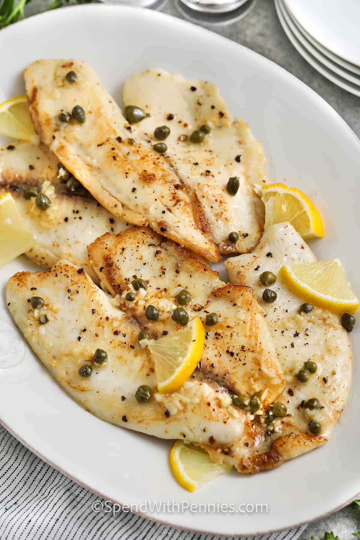 Tilapia is pan-fried in butter and olive oil, then topped with flavorful pan juices of capers, lemon juice, and garlic!