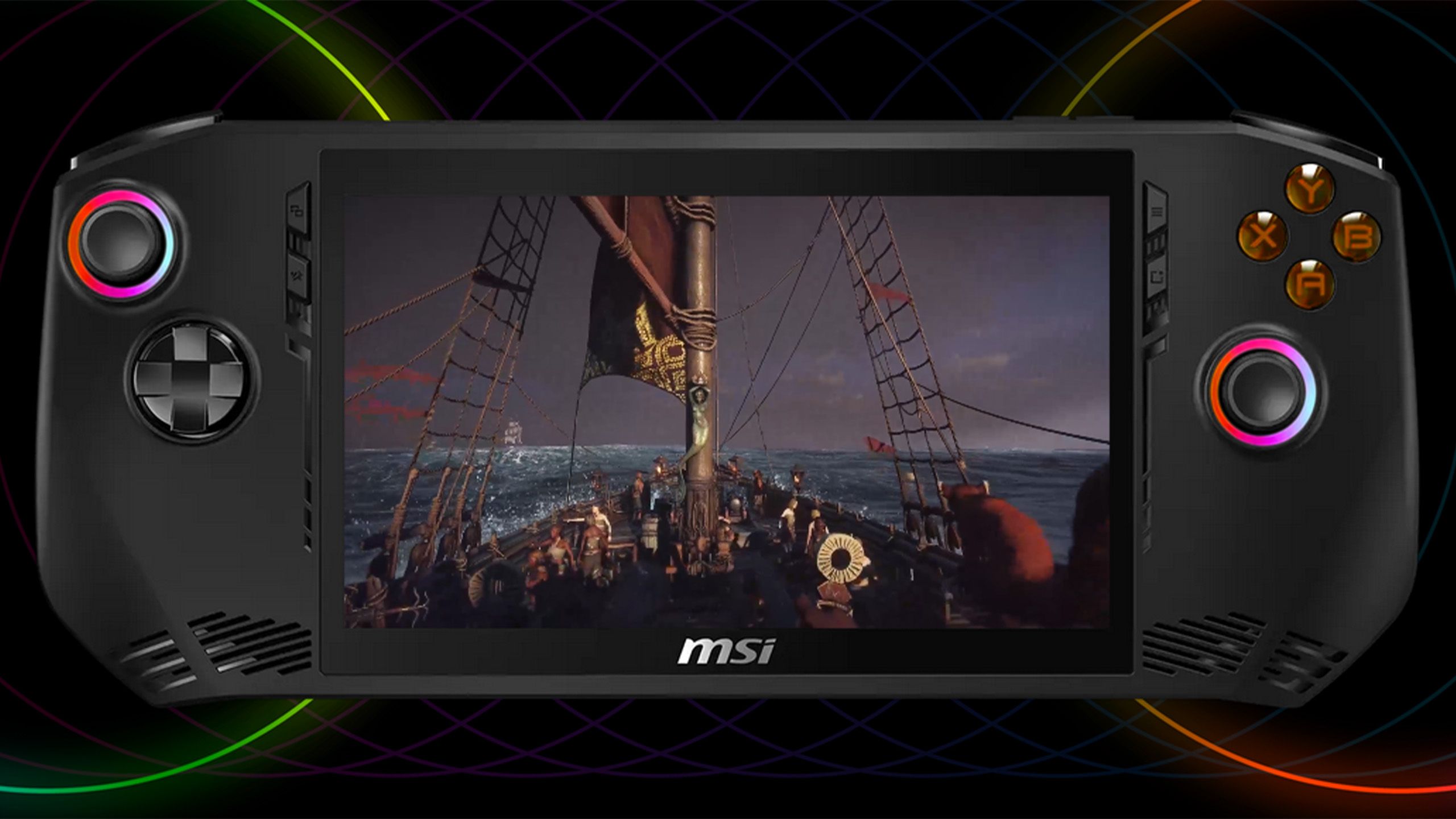 The MSI Claw appears to be like much like different PC handhelds. You could have the everyday two-joystick structure with ABXY buttons on the proper and a d-pad on the left. All of the ports, together with the amount rocker and energy button, are alongside the highest backbone, whereas the underside is usually empty. The left and proper joysticks have RGB lighting that you would be able to nearly actually customise by way of MSI Middle.