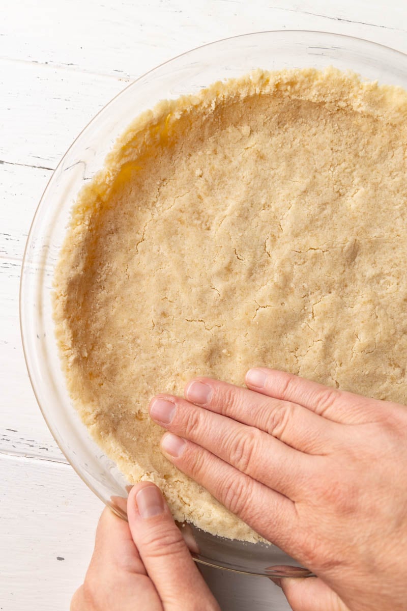 - Use a flat-bottomed cup or measuring cup to press the combination evenly into the pie plate.