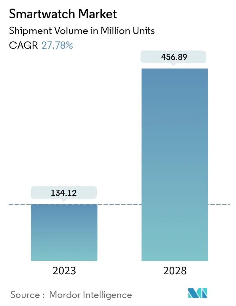 - In response to the report of Mordor Intelligence, the smartwatch market cargo quantity in 2023 is meant to be 134.12 million models and 456.89 million by the top of 2028 with a CAGR of 27.78% from 2023 to 2028.