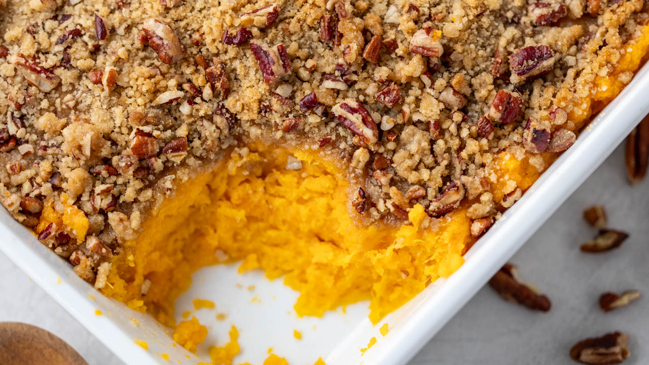 Savor the richness of a basic candy potato casserole, full with a crunchy pecan topping that would be the spotlight of any meal.